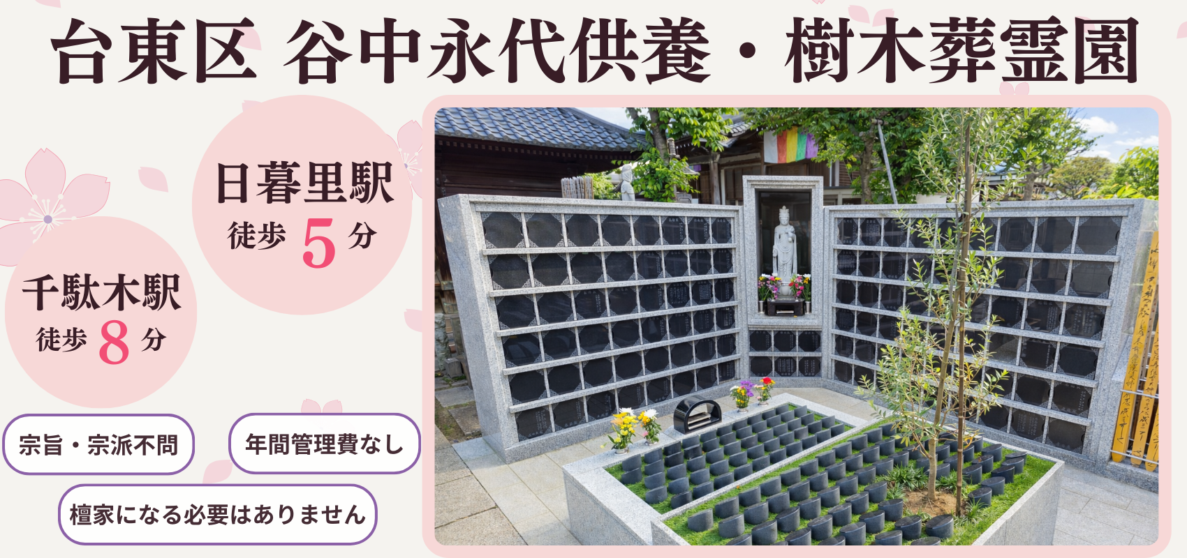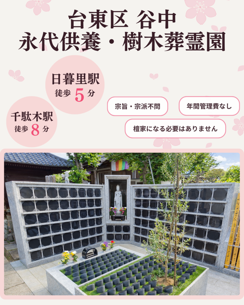 谷中観音寺・樹木葬霊園は、観音寺が管理する霊園です。JR山手線 日暮里駅 徒歩5分、東京メトロ 千駄木駅 徒歩8分の場所にあるアクセス抜群の霊園です。 谷中永代供養・樹木葬霊園のお墓について 永代供養墓「燈」燈は人数制限なし、ご家族様みんなでご使用いただけるマンションタイプの永代供養墓です。大人数でのご利用が可能ですので、お墓じまい後のお墓にも最適なお墓です。詳しく見る永代供養付き樹木葬陽当たりのよい樹木葬です。皆様からの多くのご要望にお応えし、造成いたしました。35万円〜の幅広い金額帯からお好きな区画をお選びいただけます。詳しく見る 交通案内 アクセスJR山手線日暮里駅徒歩5分東京メトロ千駄木駅徒歩8分〒110-0001東京都台東区谷中5-8-28Googleマップで確認する 資料請求まずはお気軽にお問い合わせください。資料送付はこちら 観音寺について谷中永代供養・樹木葬霊園は観音寺がお守りしている霊園です。観音寺は、観音寺は徳川家康が江戸幕府を開いてまもない慶長十六年(1611)に創建され、延宝八年(1680)に神田から現在地に移転しました。観音寺について詳しく見る